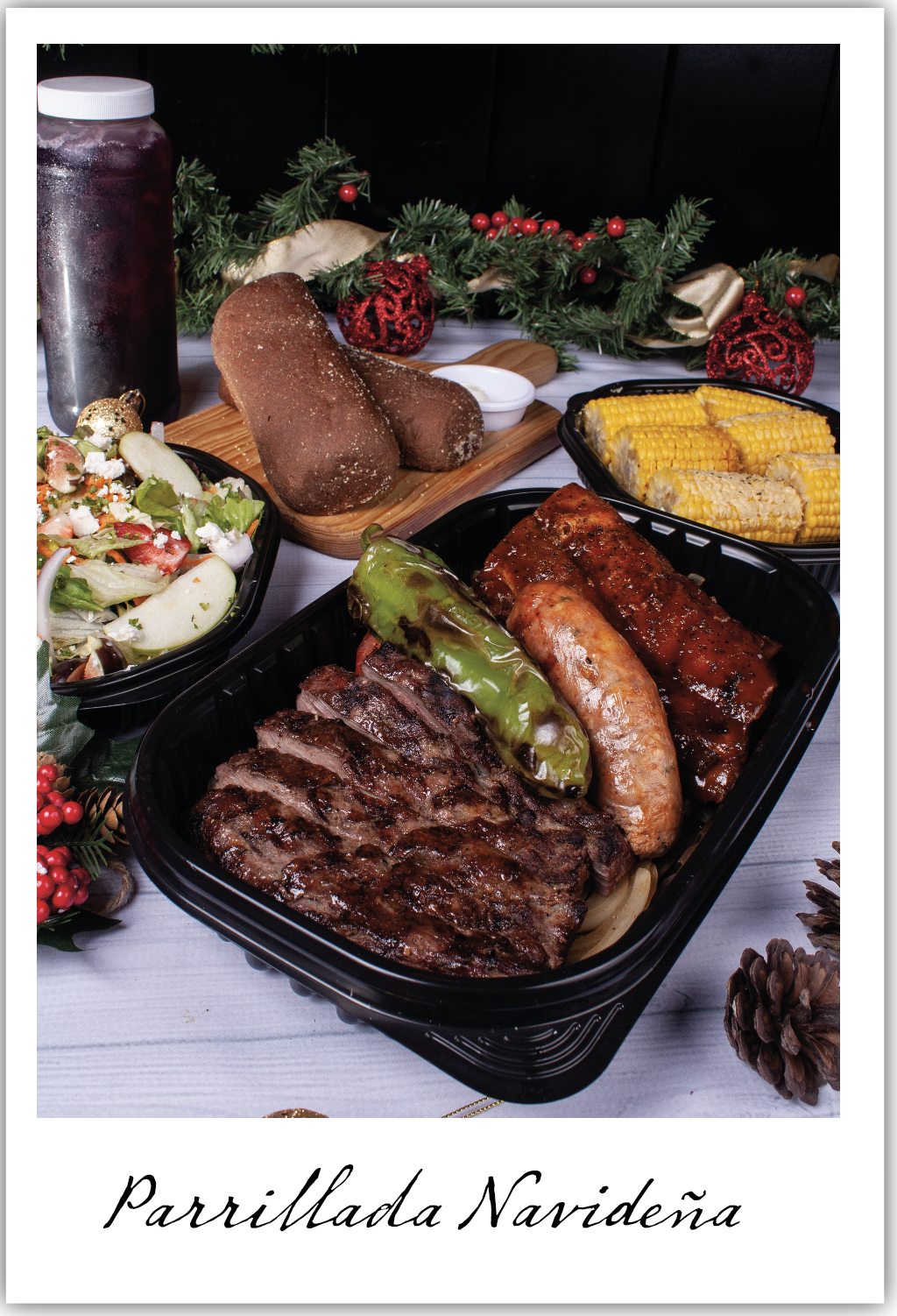 Medio Kilo de Vacío Argentinoun Costillar Baby Back y una pieza de salchicha casera. Incluye una Ensalada Queensland navideña, dos panes aborígenes, un litro de sangría, puré de papa familiar y tres elotes a la mantequilla.