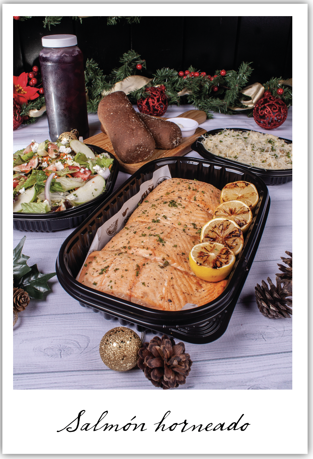 900 grs. de nuestro salmón chileno horneado lentamente por varias horas, con un toque de finas hierbas y mantequilla. Incluye una Ensalada Queensland navideña, dos panes aborígenes, un litro de sangría tradicional, puré de papa familiar y tres elotes a la mantequilla.