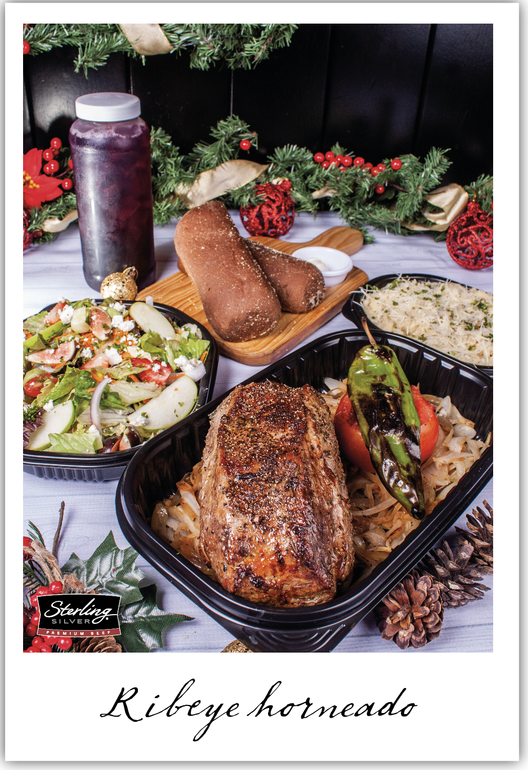 Un kilo y medio de nuestro ribeye horneado lentamente por varias horas y sellado al sartén. Acompañado de cebollas parrilladas, rodaja de jitomate rostizado, chile a la parrilla y nuestro tradicional jugo de carne. Incluye una Ensalada Queensland navideña, dos panes aborígenes, un litro de sangría tradicional, puré de papa familiar y tres elotes a la mantequilla.